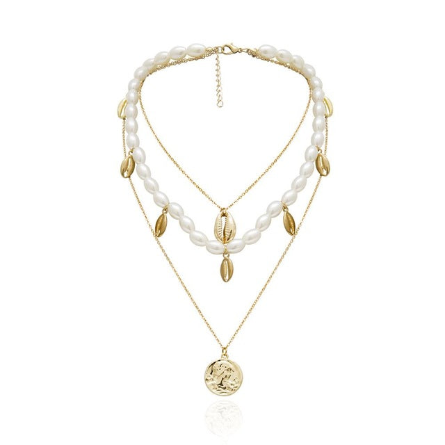 Pearls Multi-Layer Necklace Cross Pendant Gold Coin Jewelry