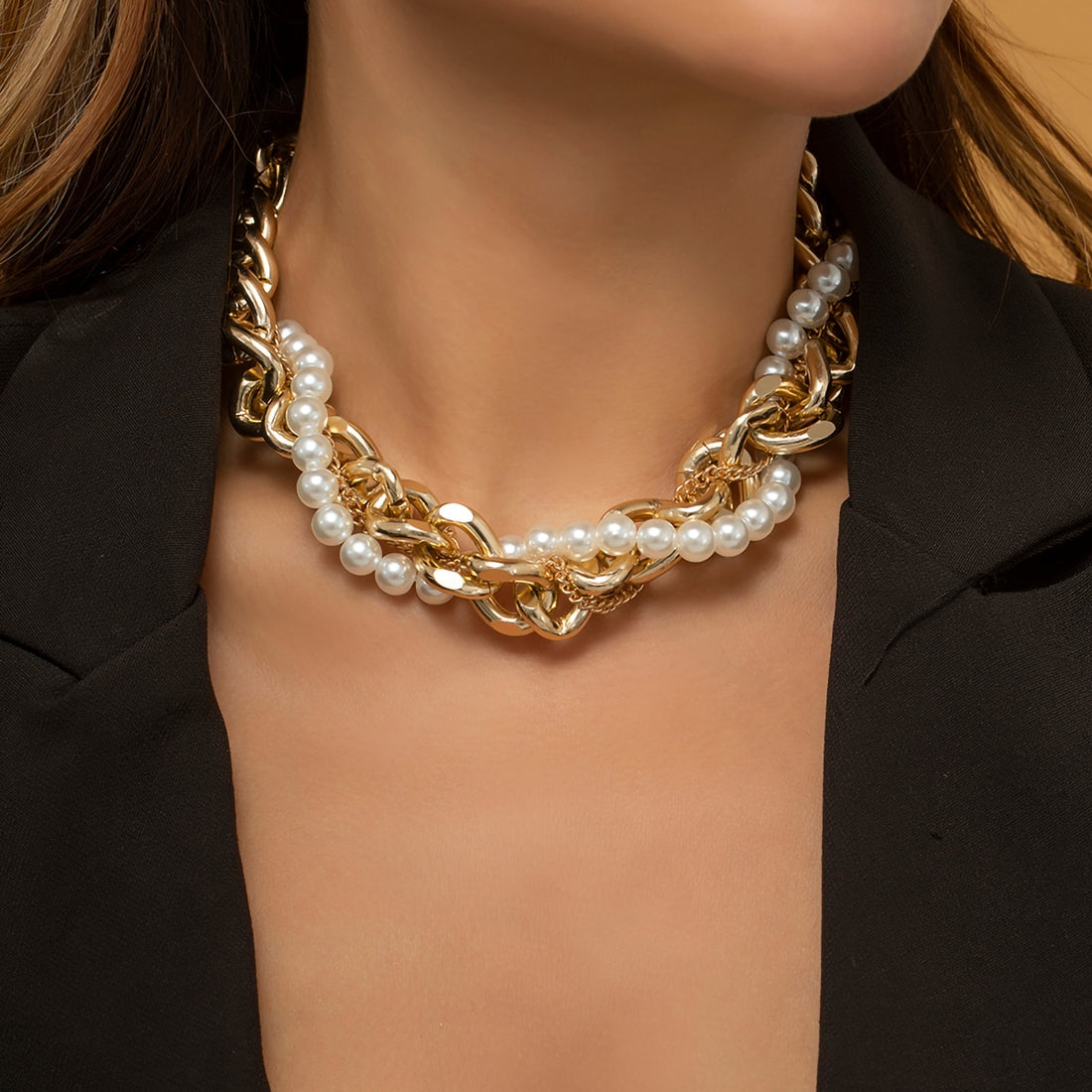 Imitation Pearl Gold Plated Necklace Thick Chain Designer Elegant